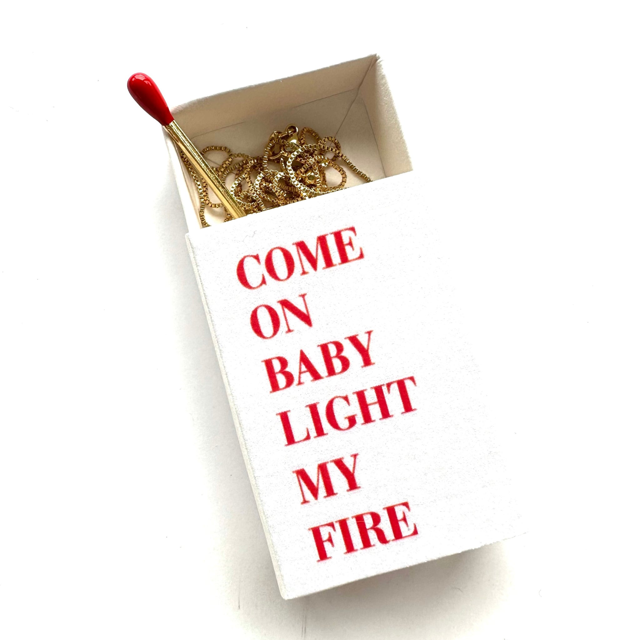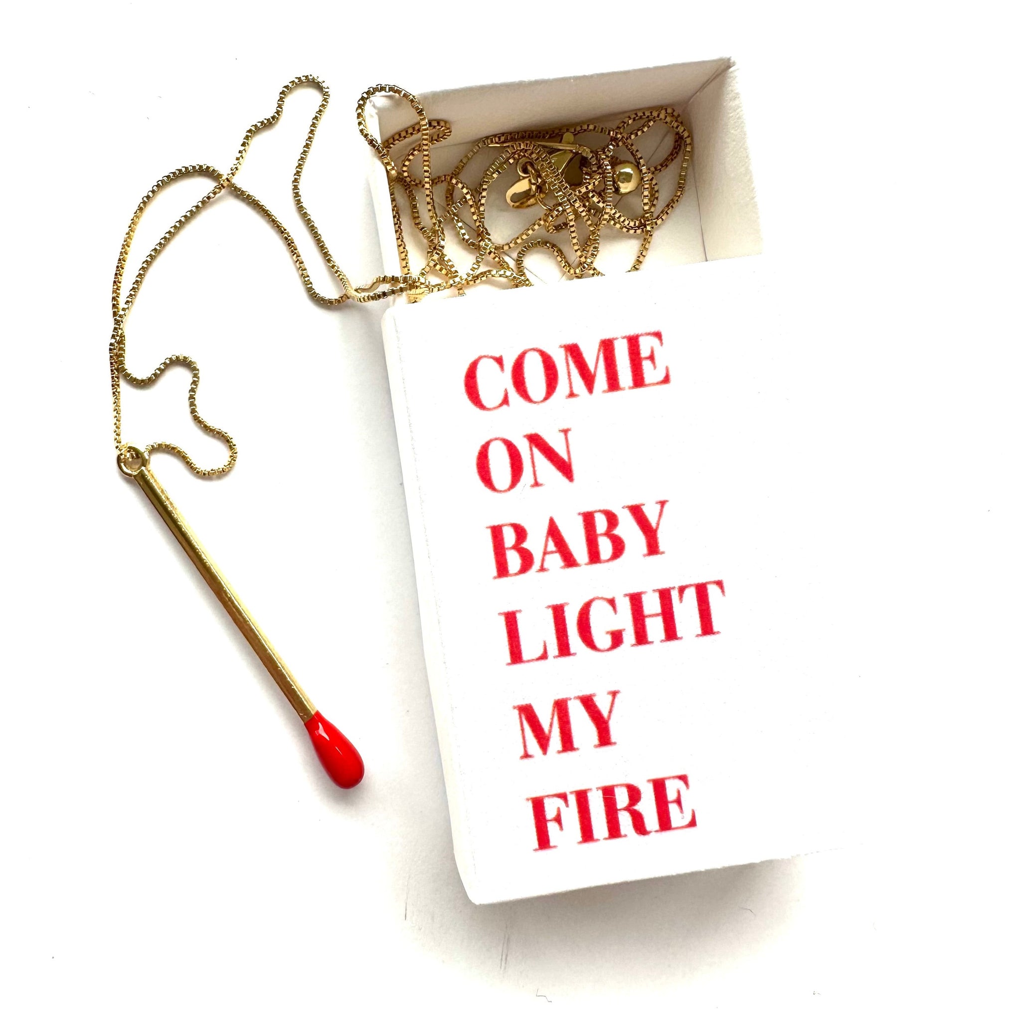 La collana viene presentata nella sua confezione dedicata: una scatolina originale ispirata al mondo dei fiammiferi, stampata con la frase “COME ON BABY LIGHT MY FIRE”. Un packaging talmente iconico che la rende un regalo già pronto, divertente e assolutamente unico.